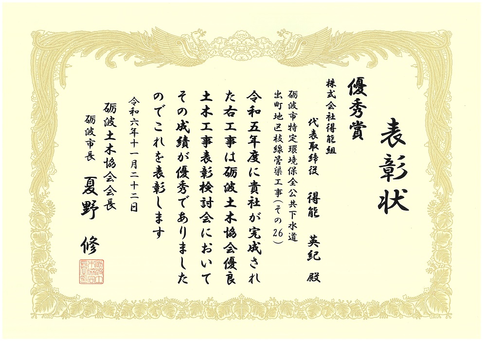 優良土木工事表彰 良賞 |